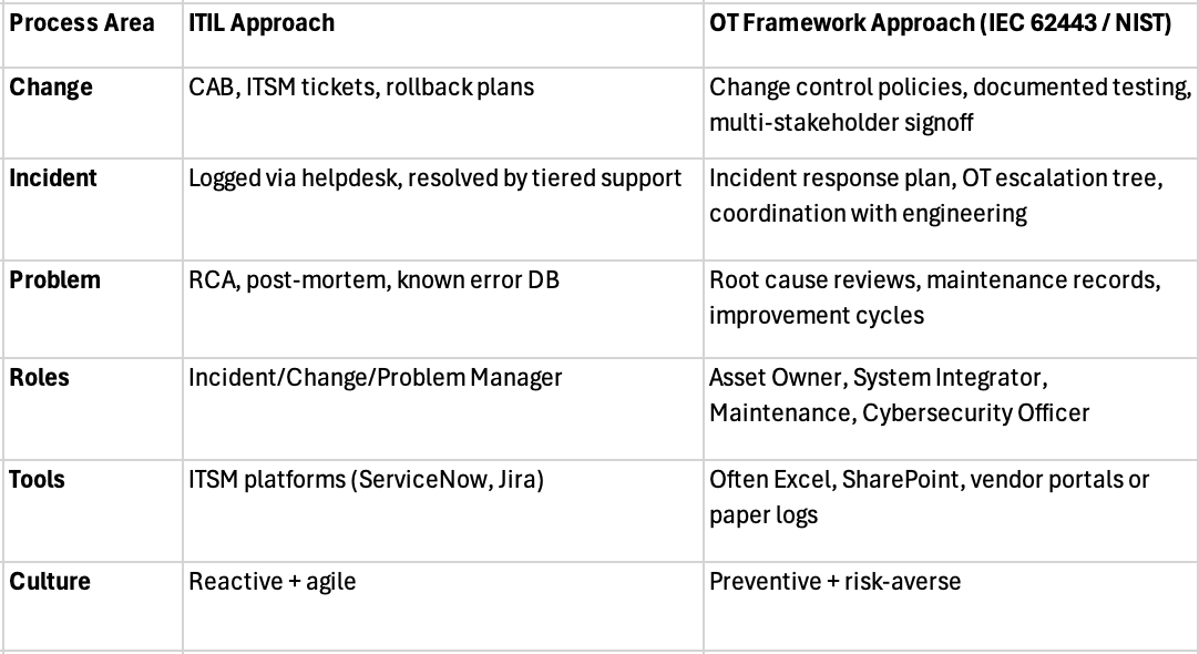 While ITIL has clearly defined roles, OT environments often operate with lean teams. Still, clarity is critical.