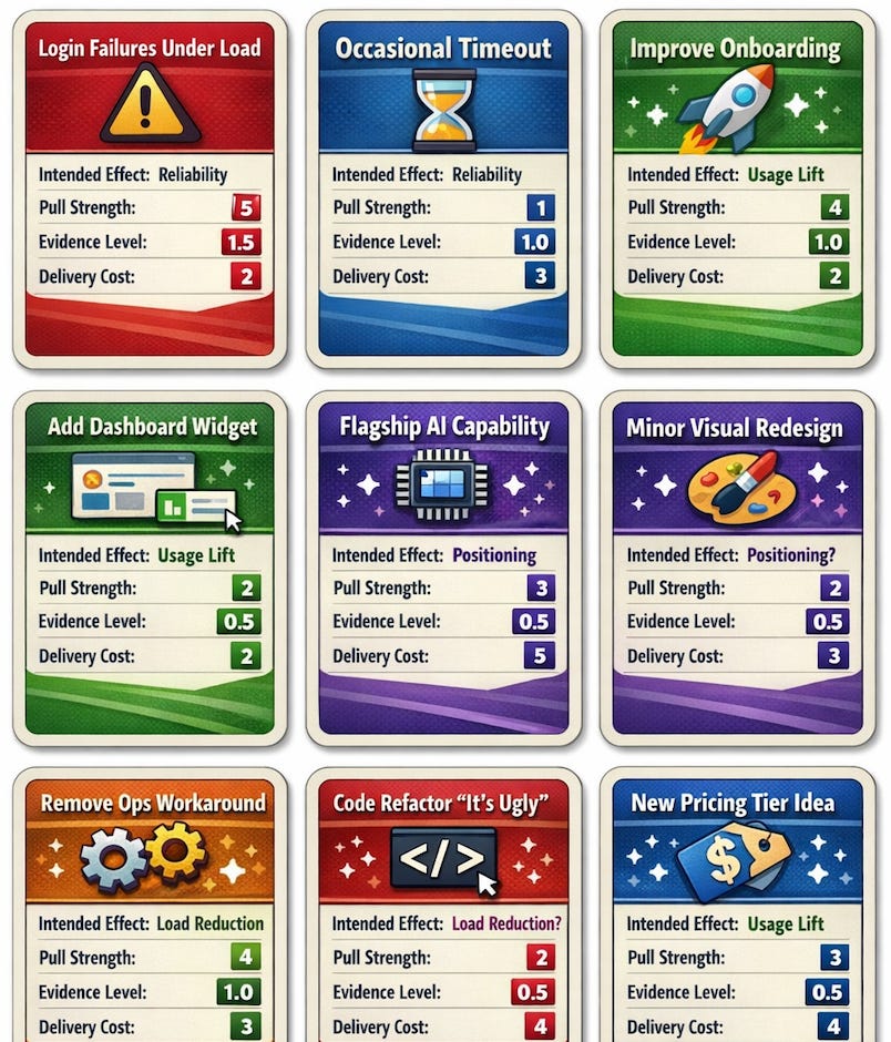 First, the team clarifies the Intended Effect. Each decision must have one primary effect: improving Reliability by avoiding disappointment, creating Usage Lift by changing behaviour or adoption, strengthening Positioning by signalling what the product stands for or achieving Load Reduction by reducing friction for users or the team. If the team cannot agree on a single intended effect, the item is not ready for decision and should be parked.