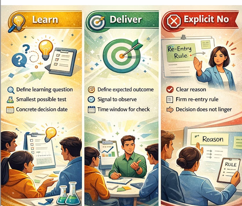 To prevent learning from becoming a parking lot, every Learn decision must define a clear learning question, the smallest possible test, the kind of evidence sought and a concrete decision date. Learning always ends in a new decision. If learning does not increase evidence or pull, the default next step is to consciously stop pursuing the item.