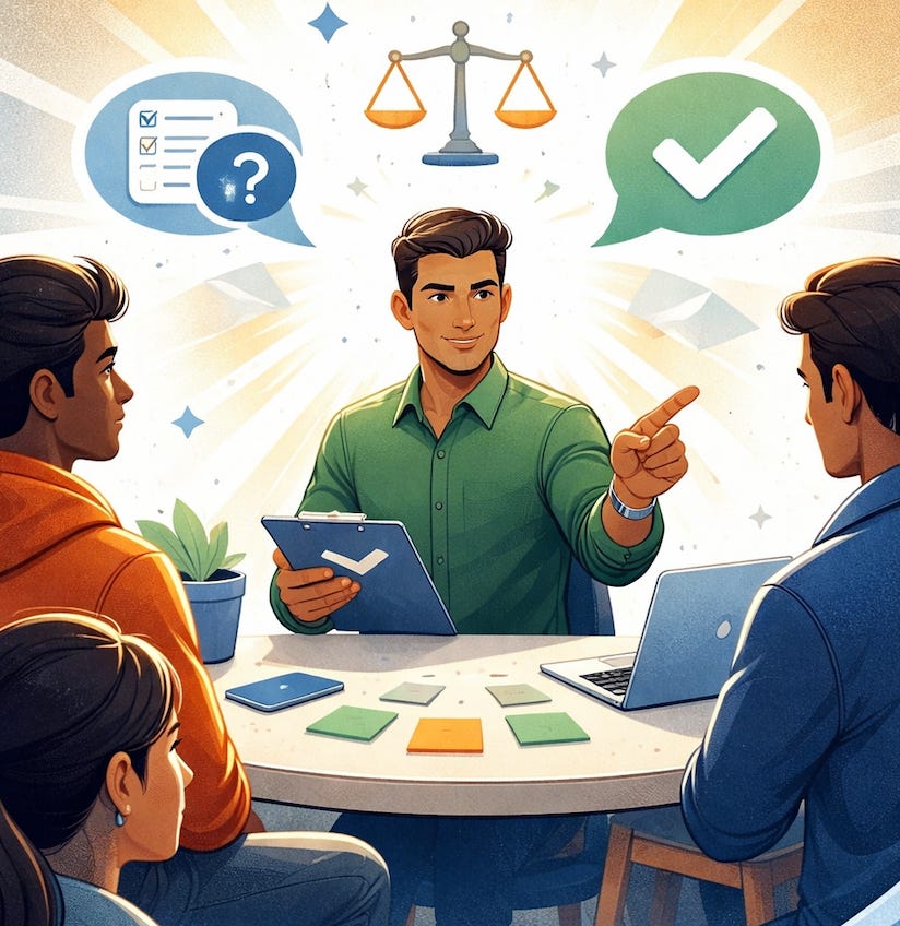 Every application of the Resonance Action Loop requires a Decision Owner. This role is not about facilitation or consensus, but about accountability. The Decision Owner listens to the discussion, weighs the trade-offs and makes the final call once the evaluation is complete.