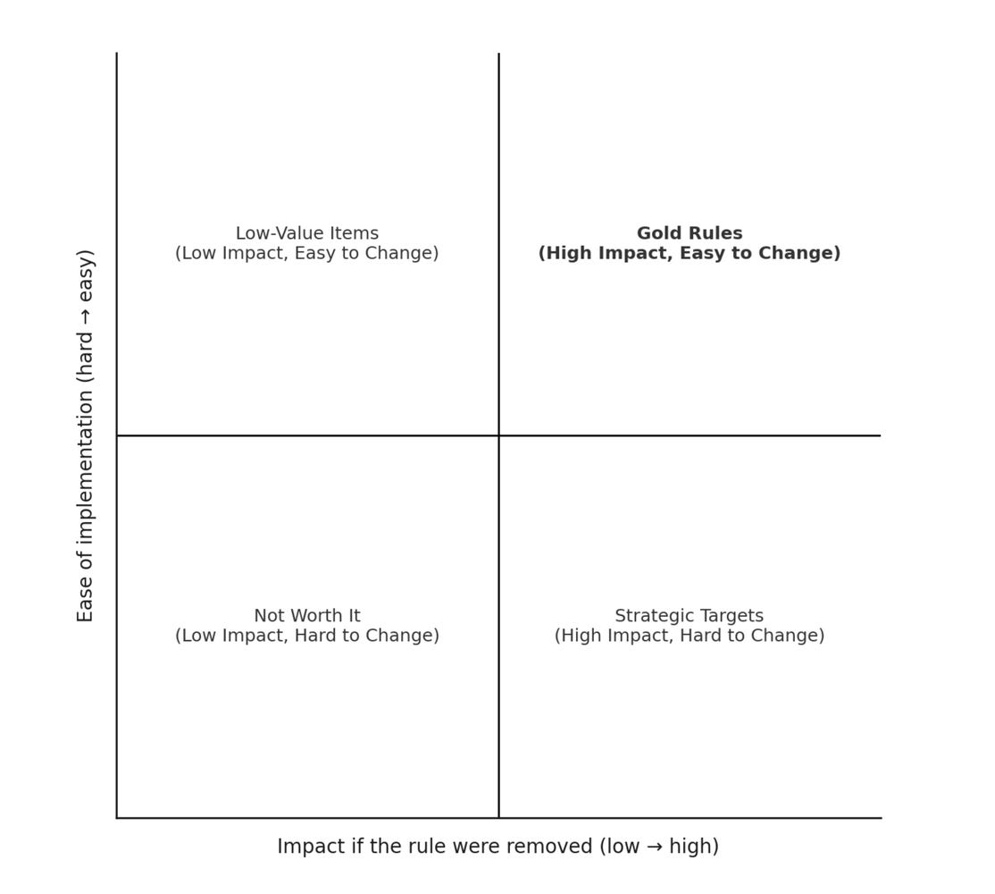 Evaluate with the matrix. Draw a 2×2 grid (see below): X-axis: Impact if the rule were removed (low → high), Y-axis: Ease of implementation (hard → easy). Place the rules in the grid. Focus first on the "Gold Rules" in the top-right corner (easy to remove, big effect).