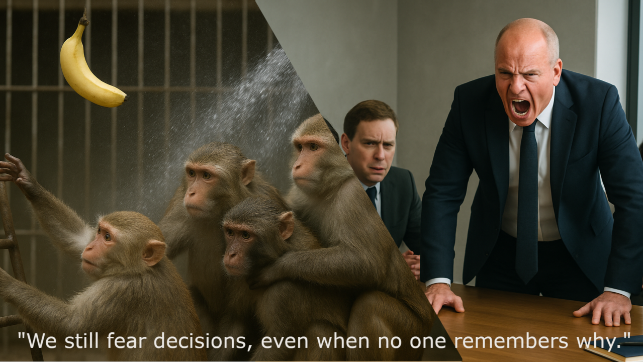 As a literal experiment, this story never happened. Its roots trace back to a 1960s study by psychologist G.R. Stephenson, who used pairs of rhesus monkeys and air blasts, not bananas or ladders. Later retellings reshaped it into today´s parable. The fable survives because it illustrates something real: organizations often inherit behaviors and fears long after the original cause has vanished.